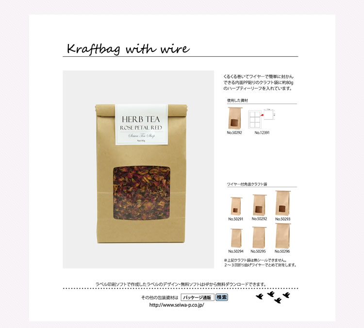 内面がPP貼りで、くるくる巻いてワイヤーを曲げて封かんするクラフト袋に約80gのハーブティーを入れています。